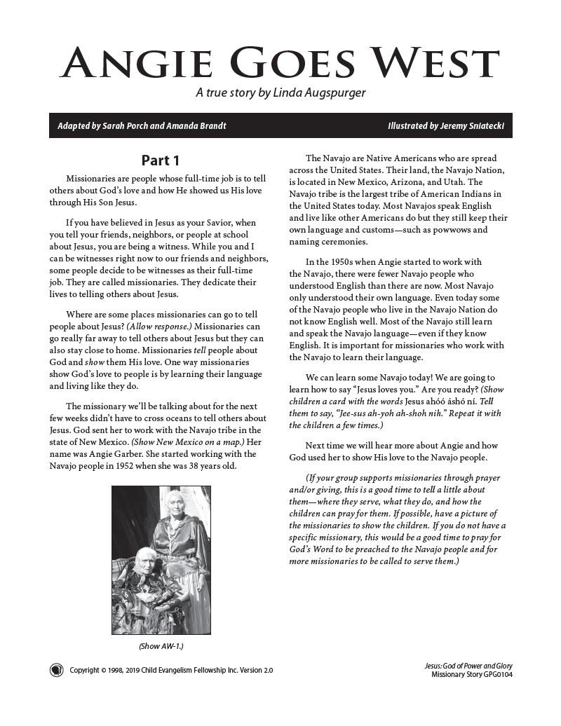 Angie Garber used her life to serve God by teaching and loving the Navajo people. She overcame many difficulties to show the love of Jesus to the Navajo people. She learned their language, visited them in their homes and spent time loving and serving them. During each lesson children will be encouraged to share the Gospel with others.
