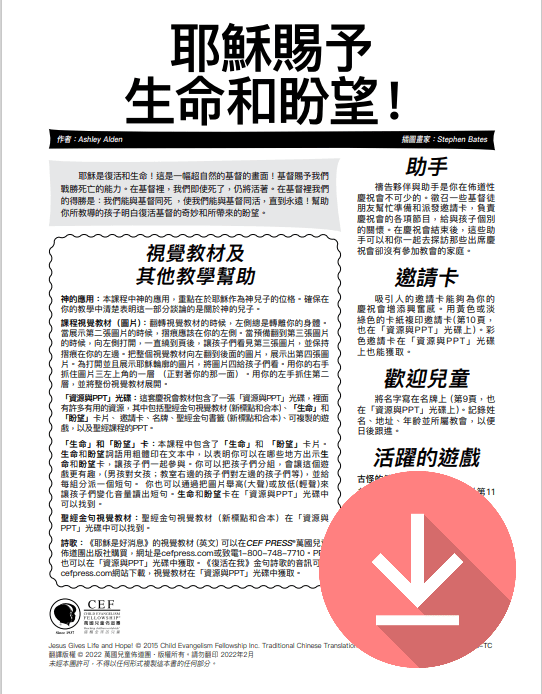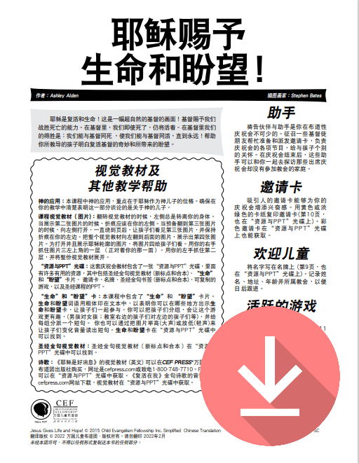 The Jesus Gives Life and Hope lesson focuses on Jesus as the resurrection and the life. He displayed His power over death when He raised Lazarus from the dead and when He gave us life and hope through His death and resurrection. This item includes the printed lesson visual which unfolds picture by picture until it shows a silhouette of the risen Christ.