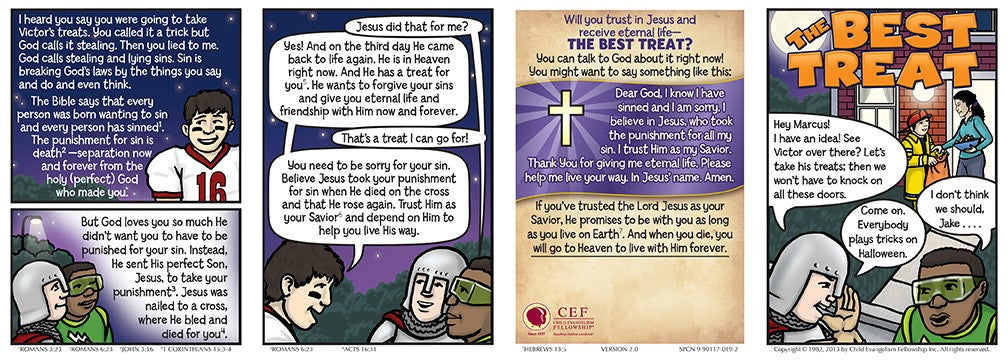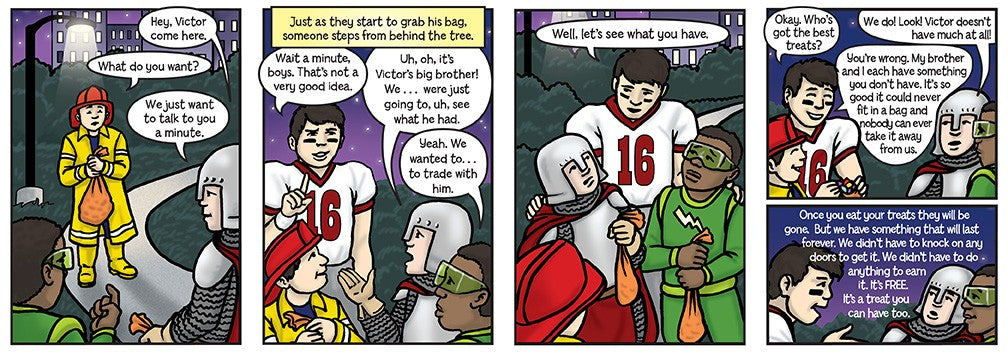 Jake and Marcus love treats and plot to steal Halloween candy from others. But they soon discover from a friend that there is an even greater treat that is given freely. A treat that only God can give.