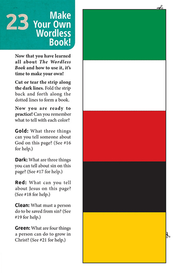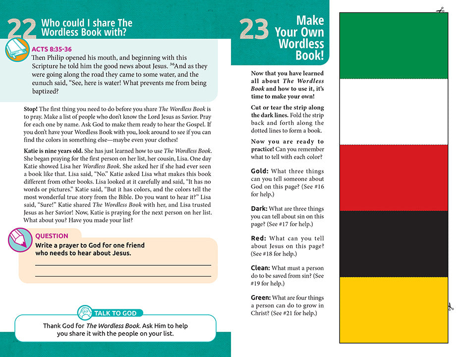 The devotional includes a make-your-own-Wordless-Book-page and teaches how to witness using The Wordless Book.
